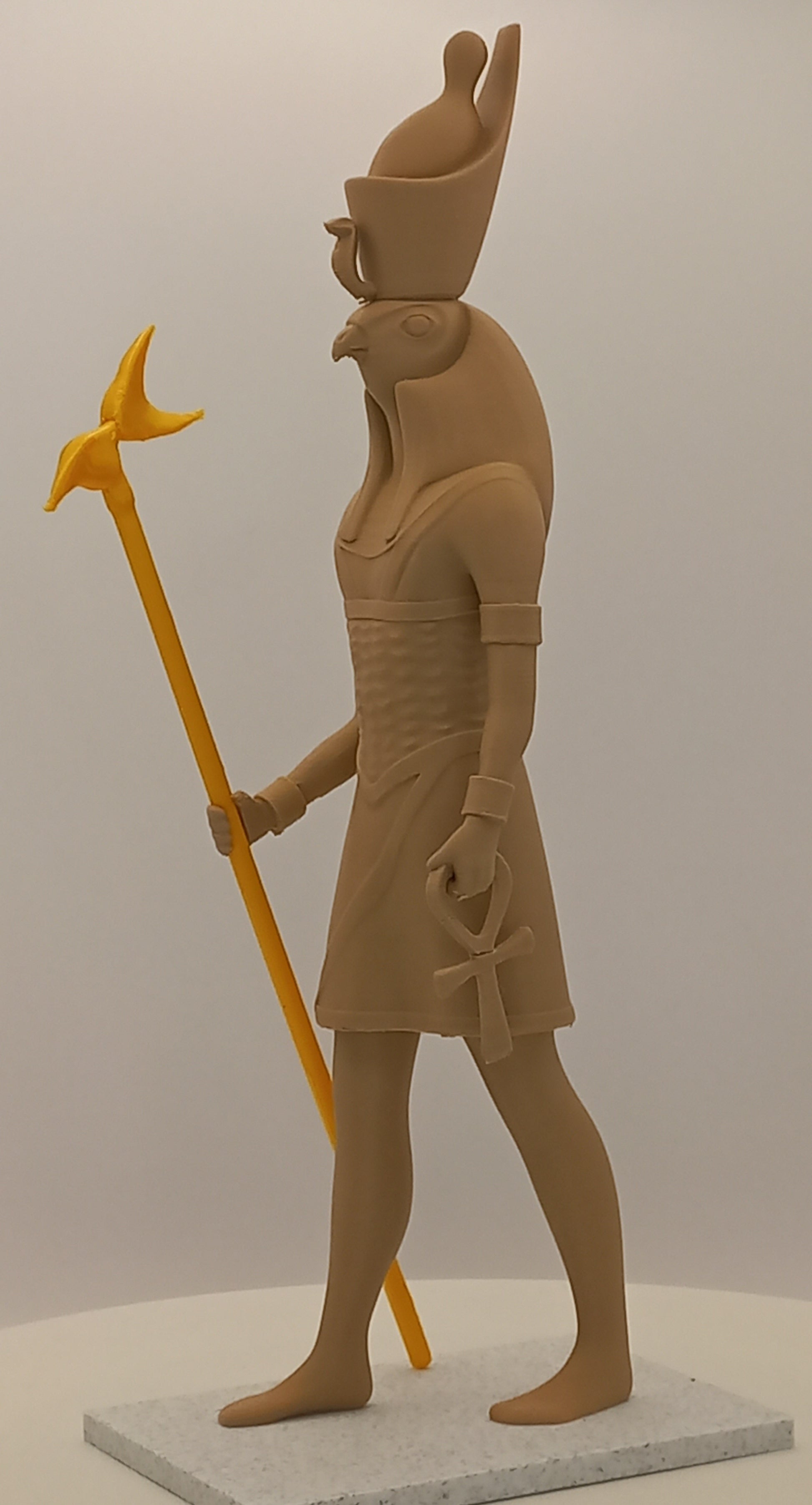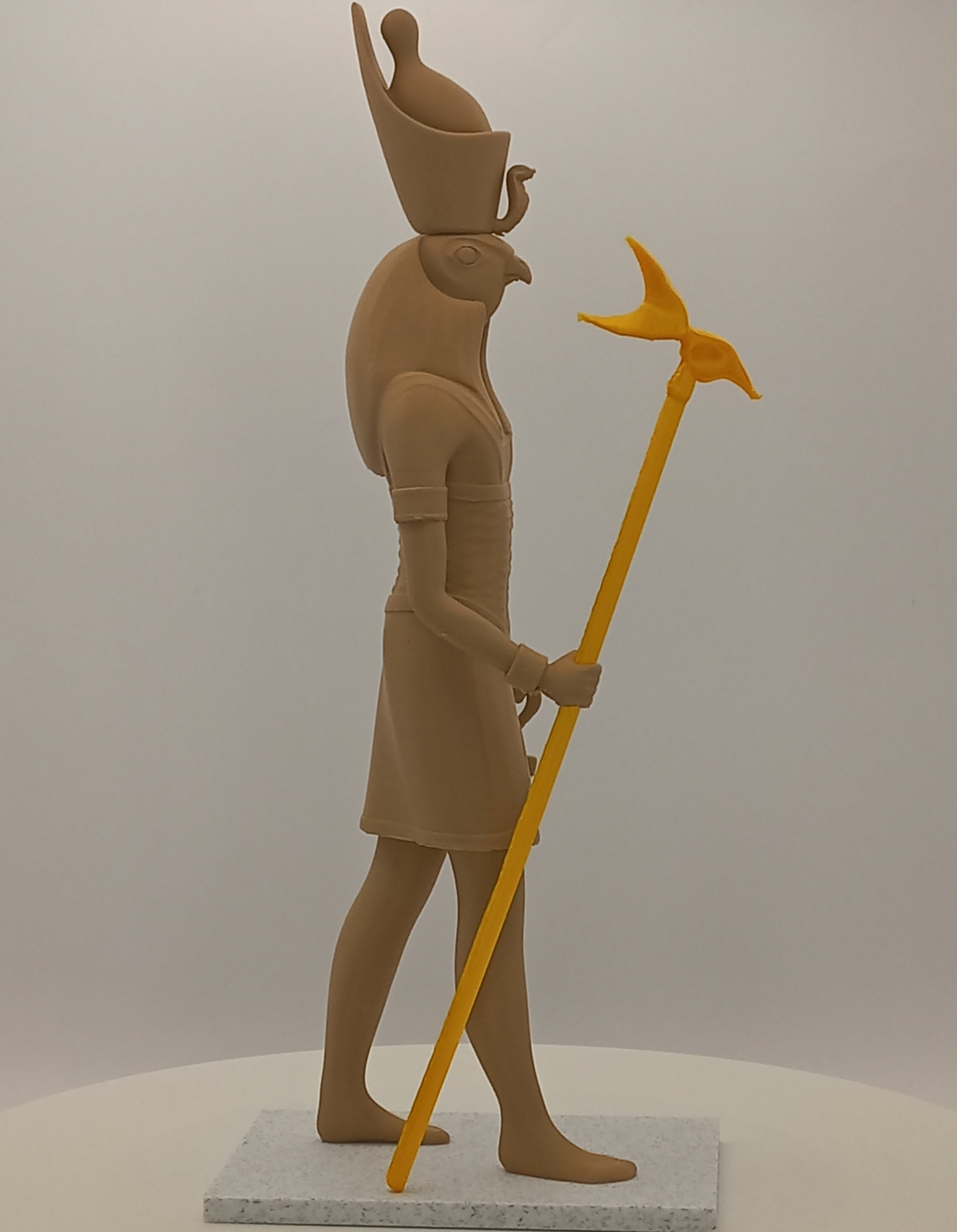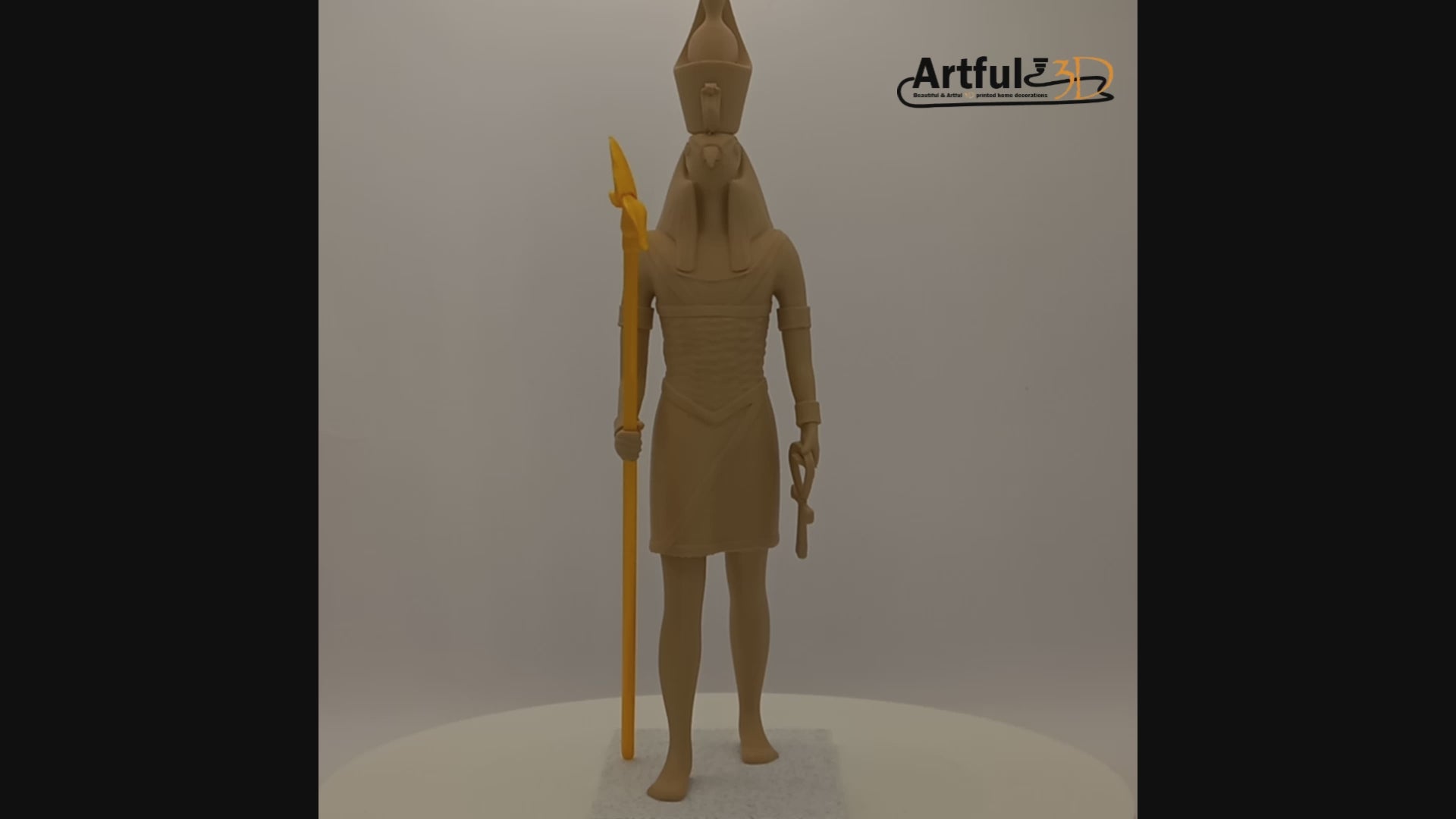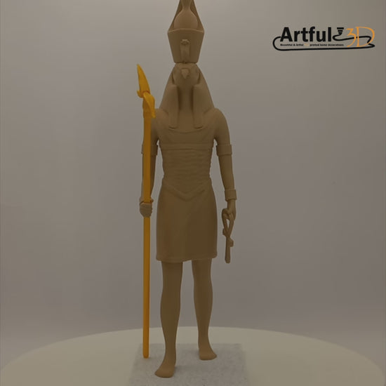 Dit zorgvuldig vormgegeven beeld toont Horus in traditionele faraonische houding, met zijn iconische valkenkop, dubbele kroon en symbolische staf en ankh – teken van eeuwig leven. De verfijnde details en de matte afwerking geven het stuk een authentieke, tijdloze uitstraling.