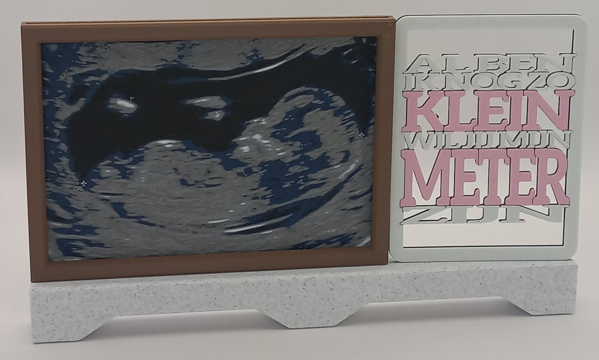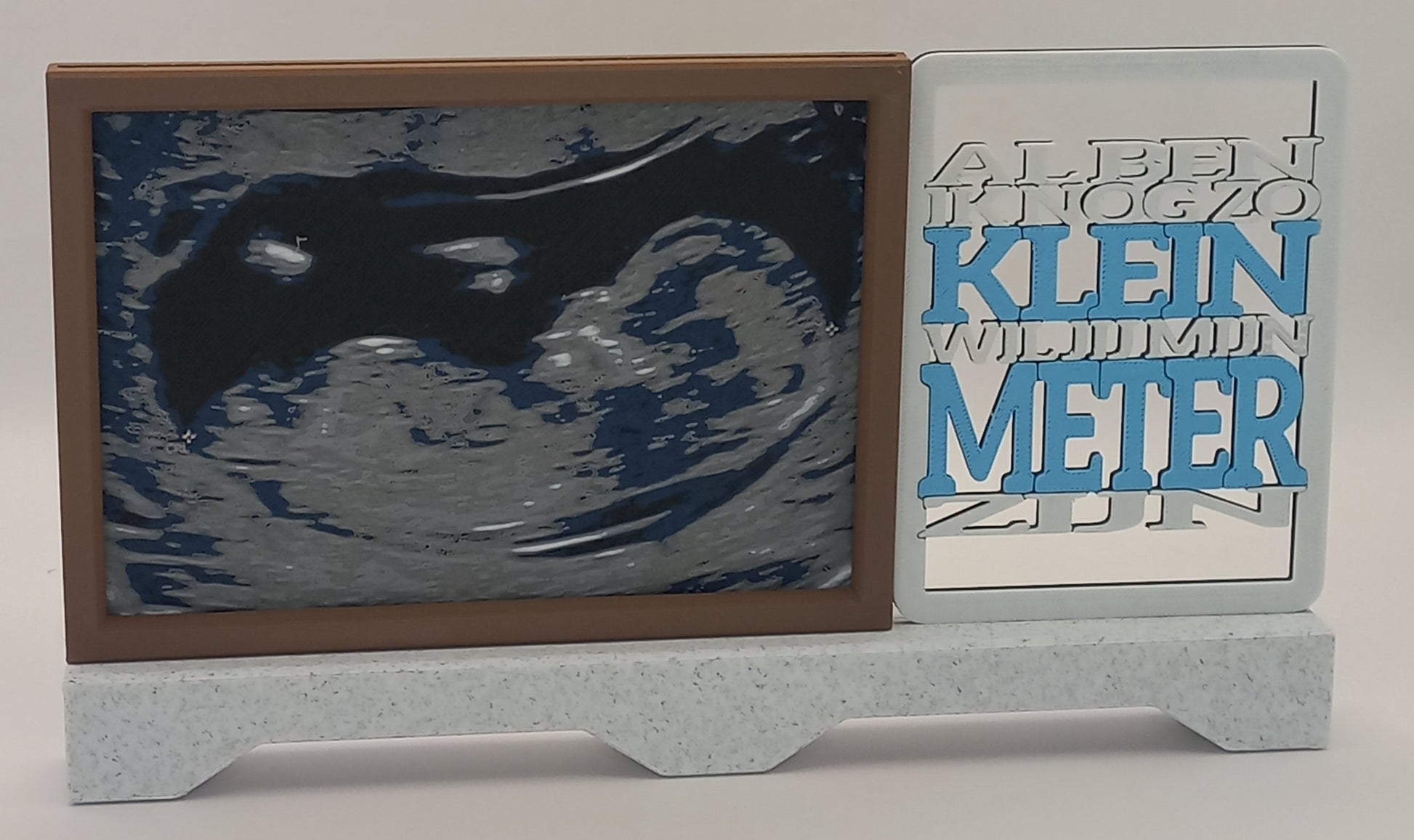 Geschenk bestaat uit een voet en frame waarin een 3D geprinte echo van jouw kleintje komt ( foto formaat 15cm op 10cm) met de daarbij horende tekst " Al ben ik nog zo klein, wilt jij mijn Meter/Peter zijn?"