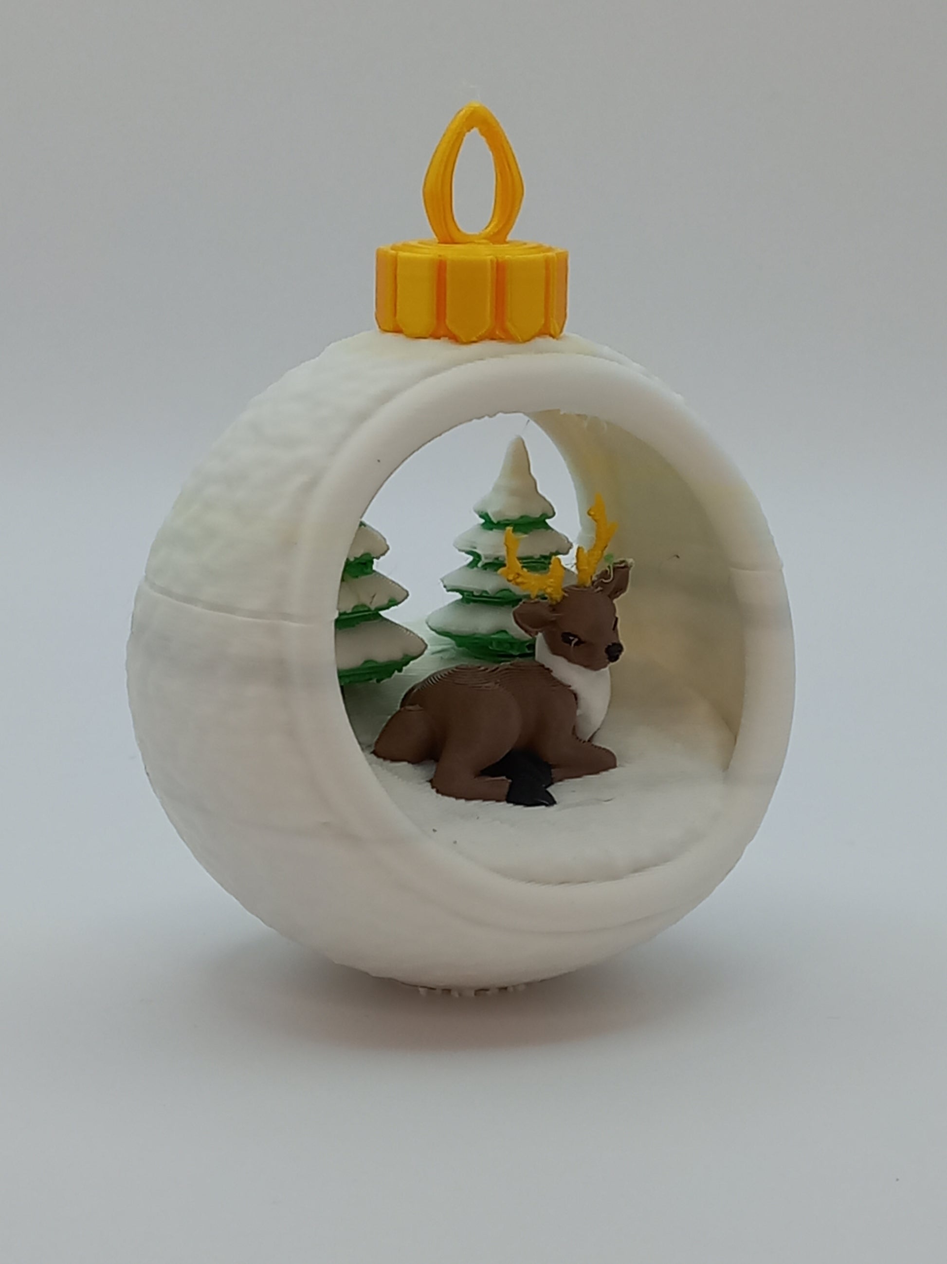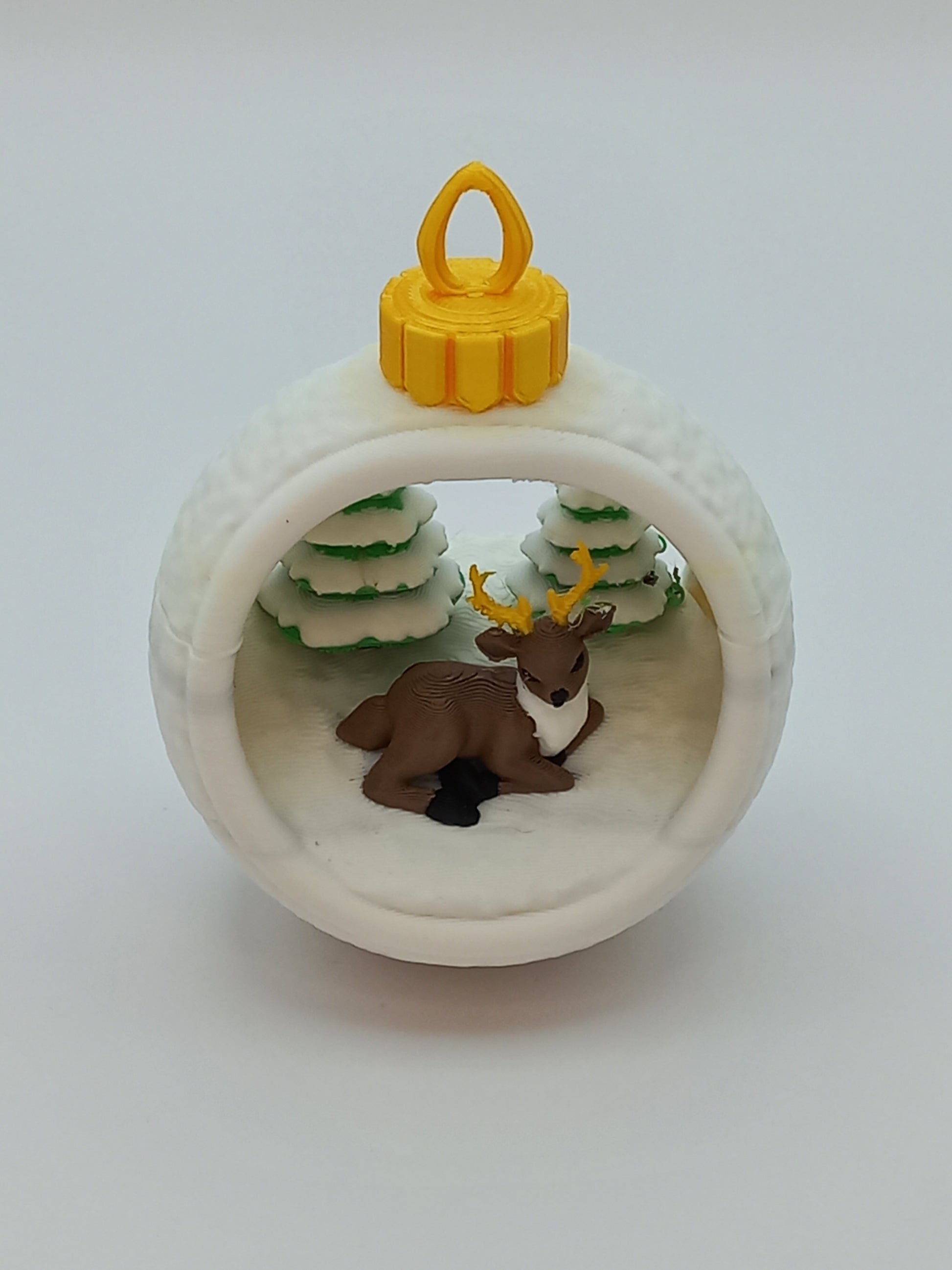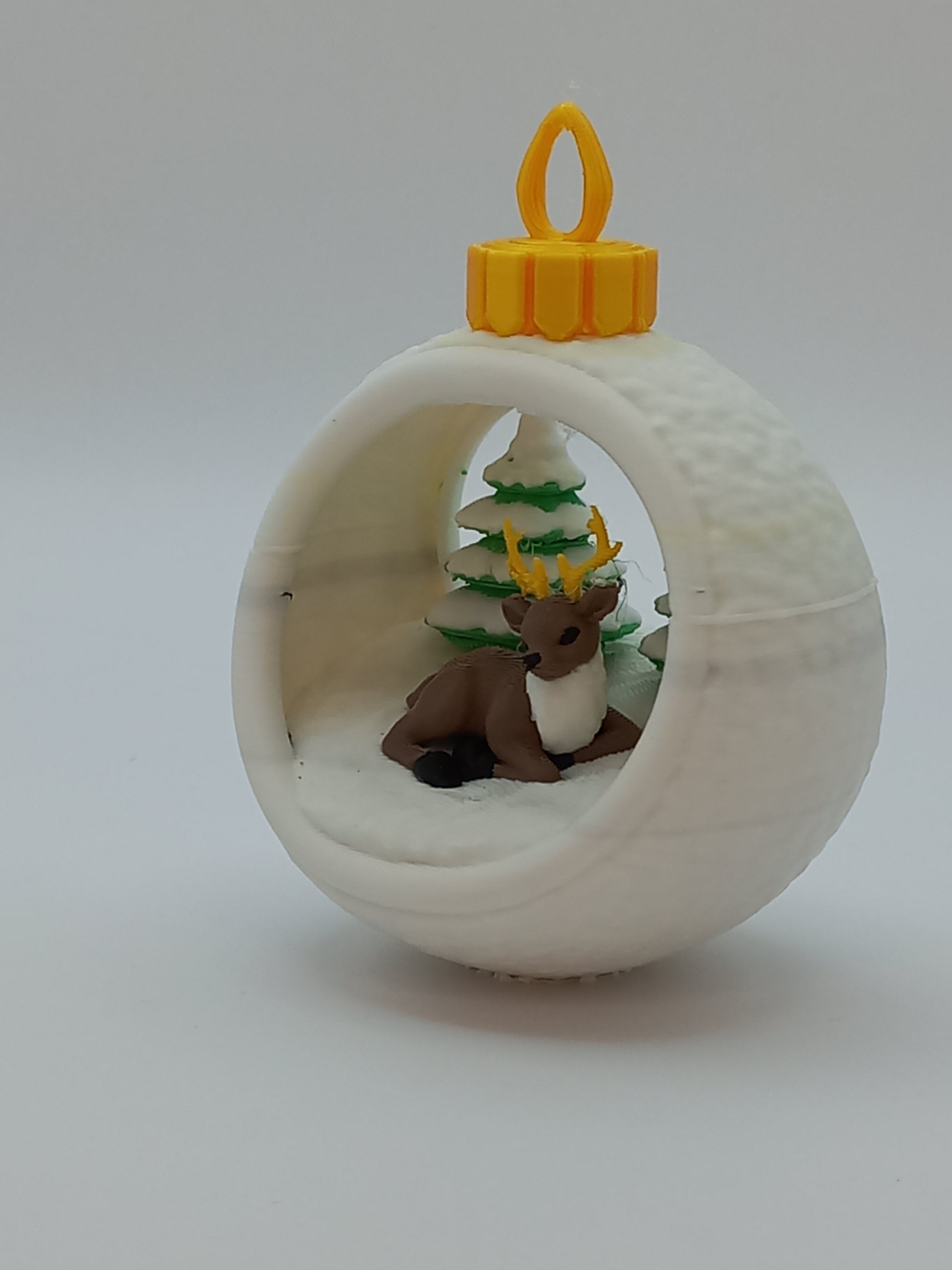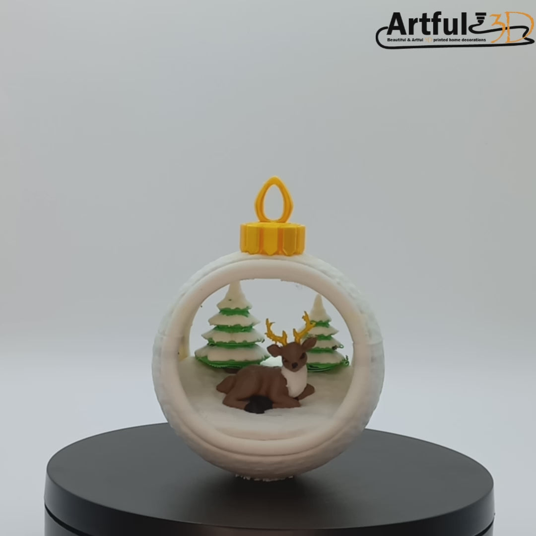 Prachtige kerstbal met winterlandschap binnen in. Tafereel van liggend hert in de sneeuw tussen de besneeuwde bomen, deze kerstbal kan perfect in de kerstboom hangen, of als versiering op de kast of op de feesttafel.