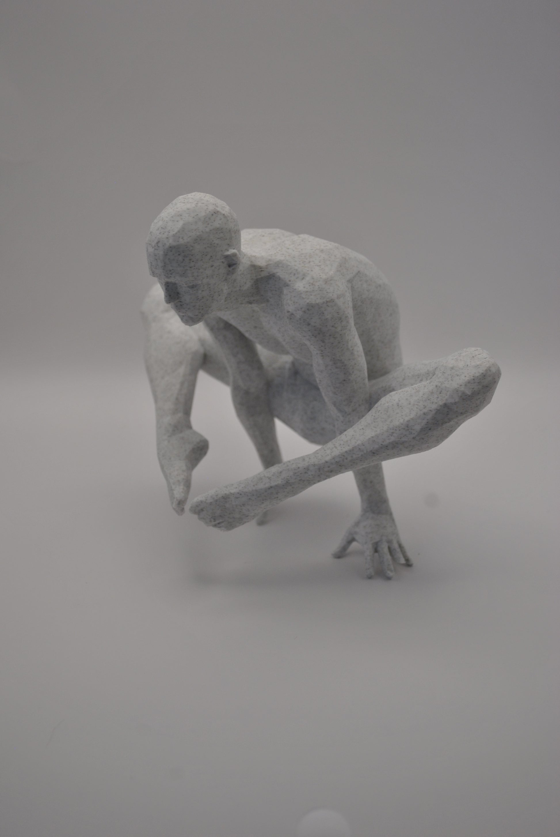Dit beeld is 15 cm hoog en geprint in Marble PLA, een hoogwaardig en milieuvriendelijk materiaal dat doet denken aan echt marmer dankzij de witte basis met fijne grijze spikkels. De geometrische stijl met strakke facetten geeft het beeld een moderne uitstraling, perfect voor een minimalistisch of kunstzinnig interieur.