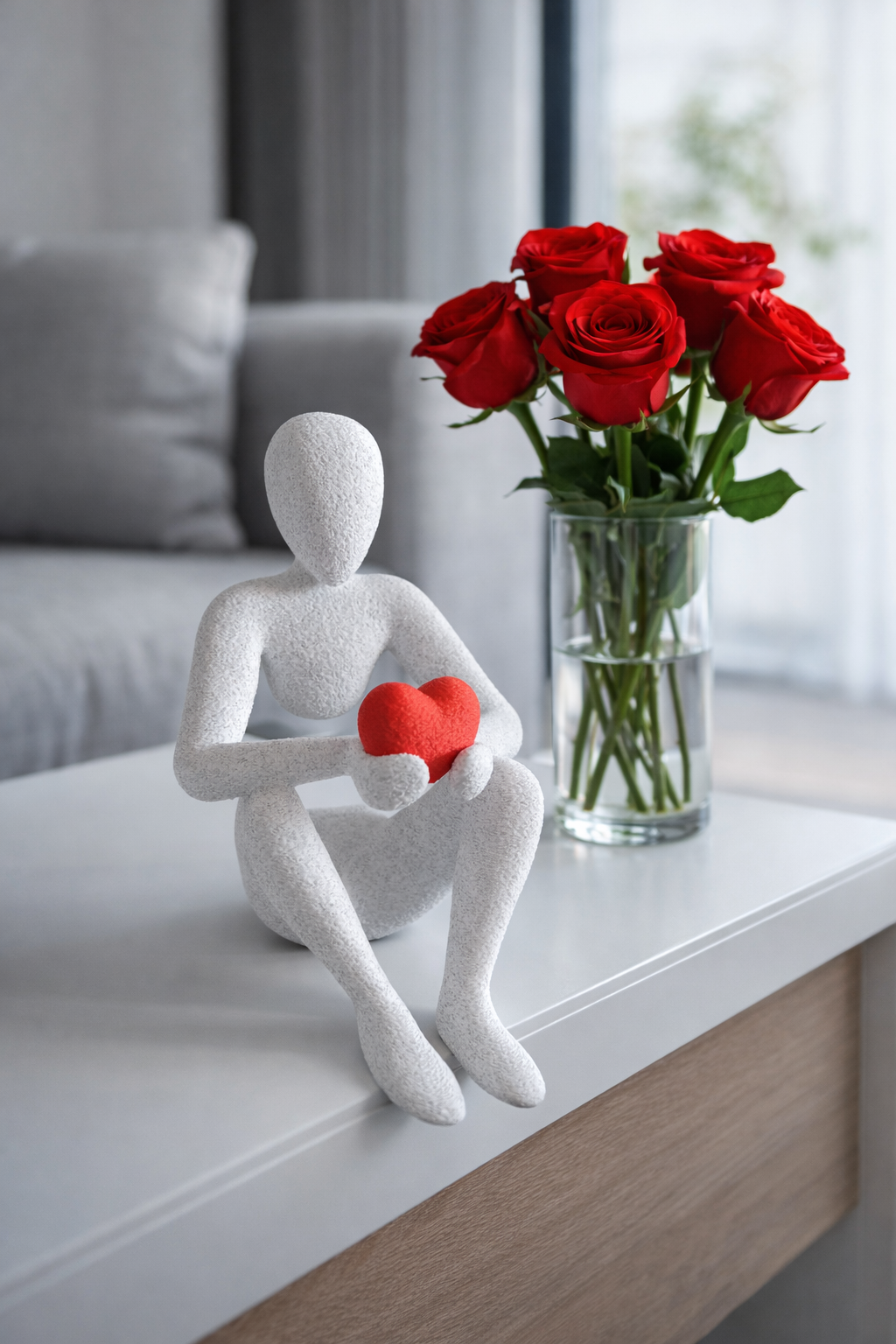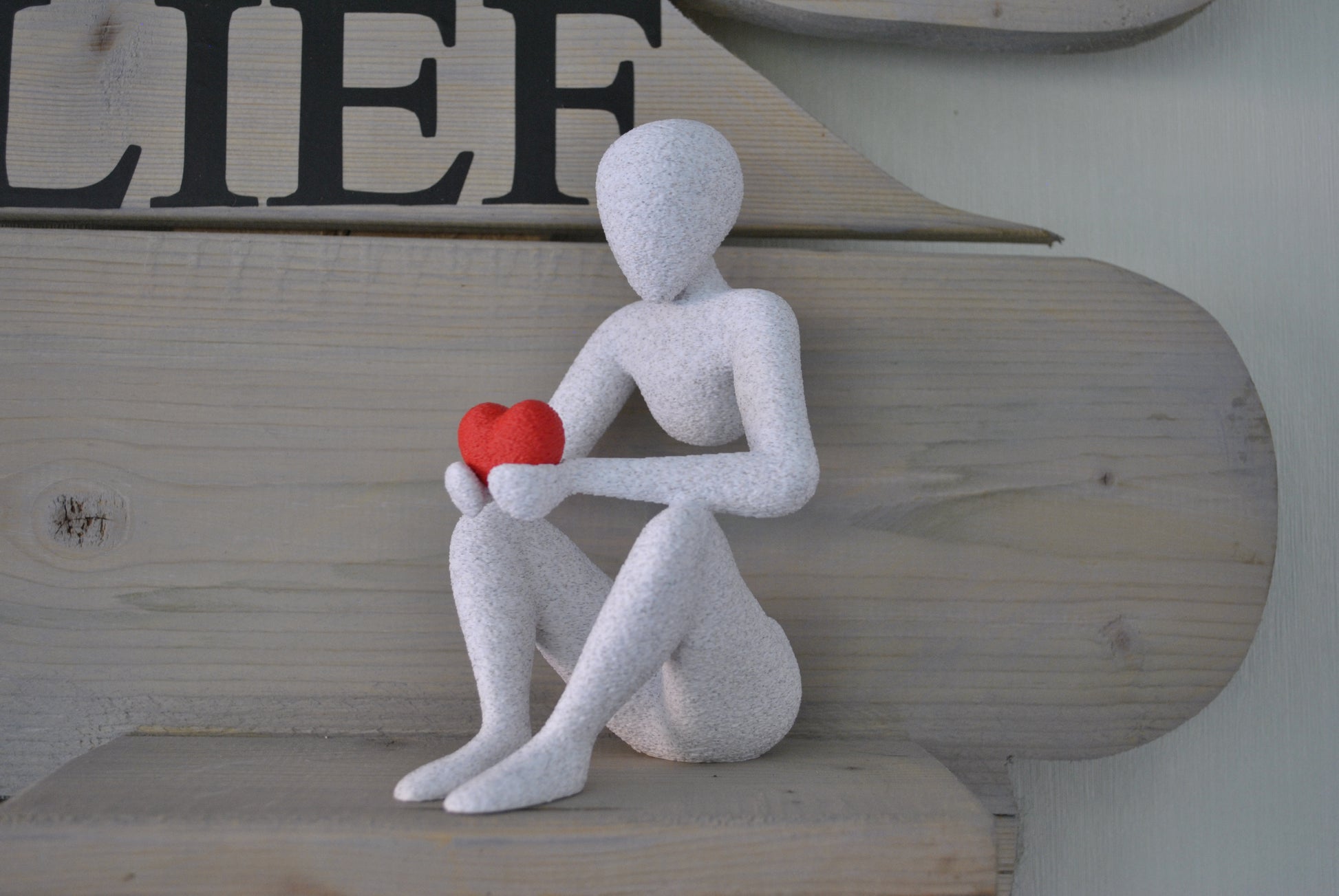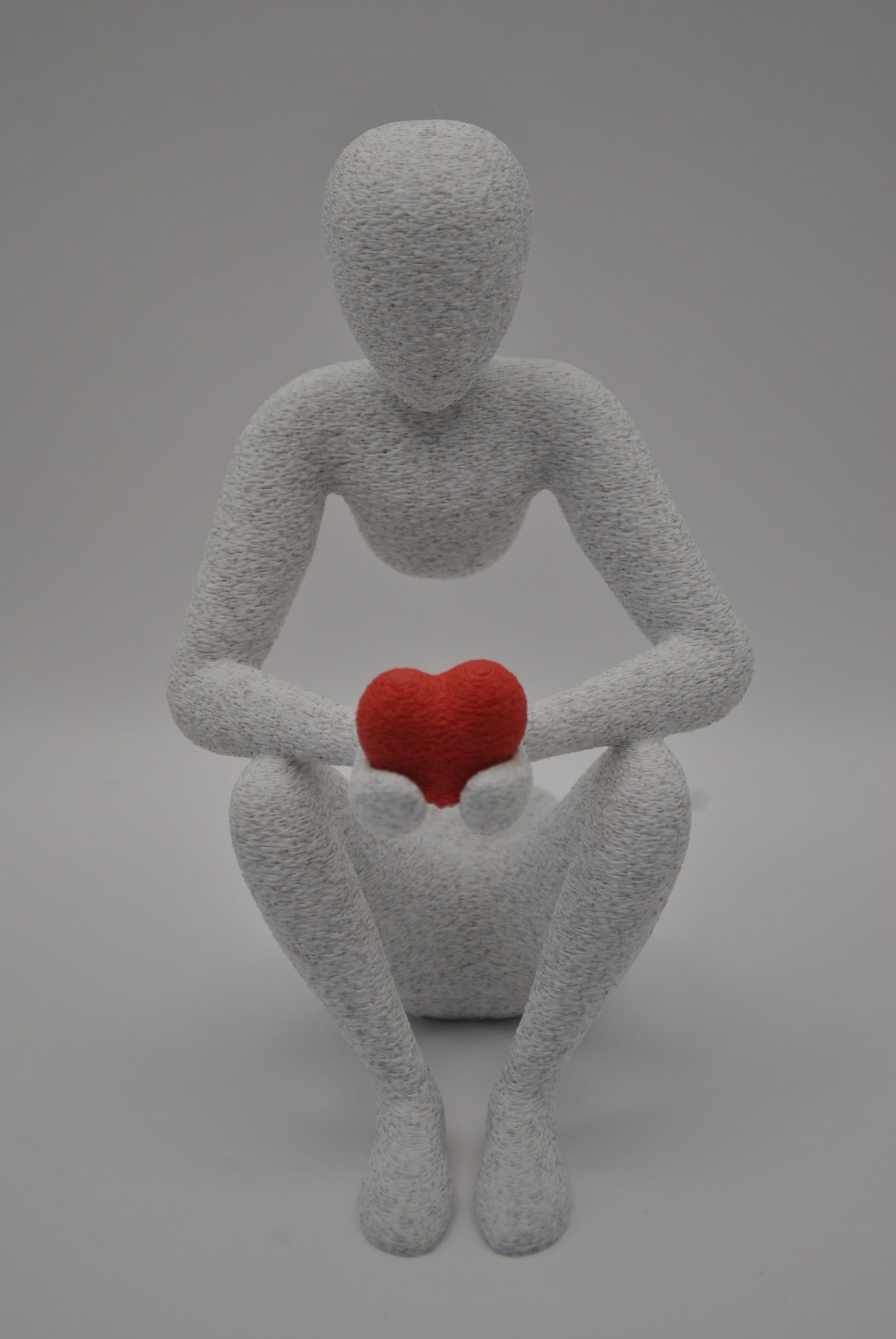 Een subtiel symbool van liefde en verbondenheid. Dit zittende figuurtje, geprint in marmerwit PLA, houdt een felrood hart stevig maar zacht in handen.