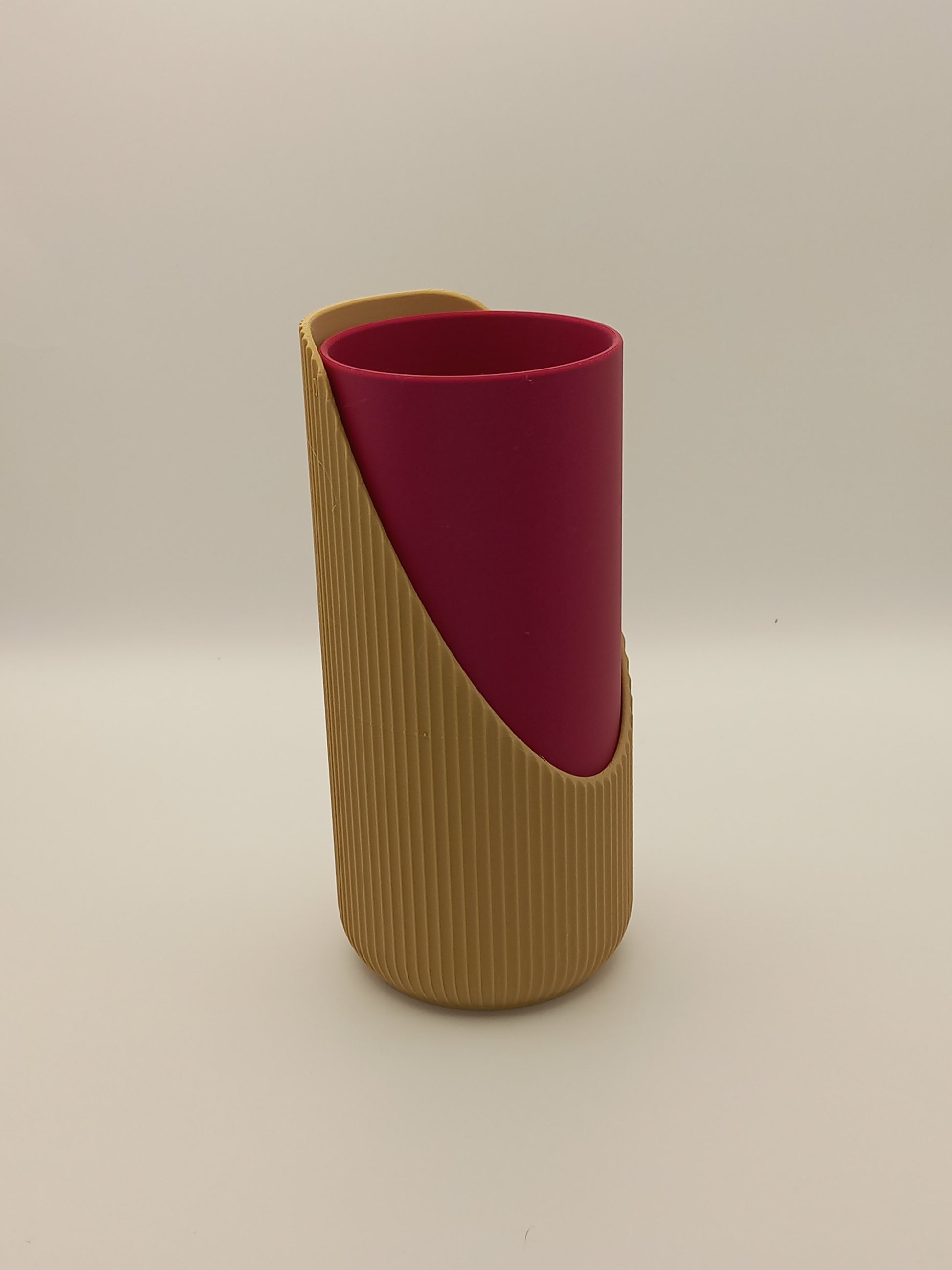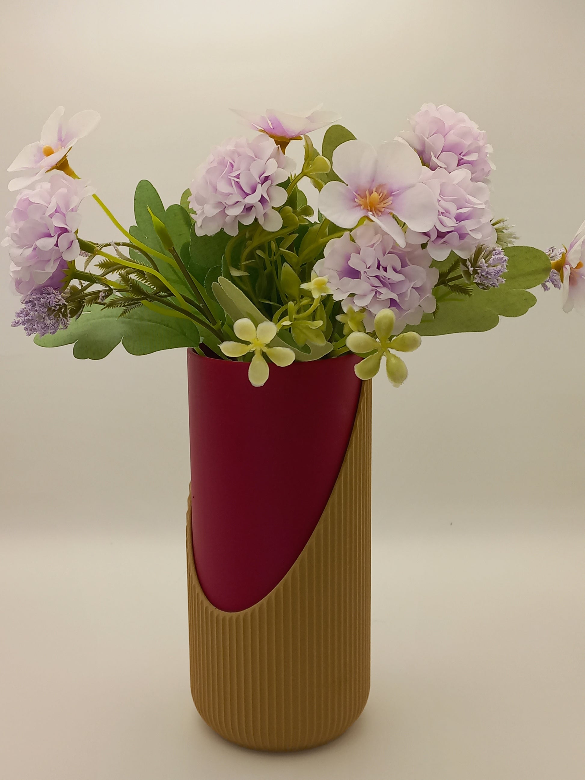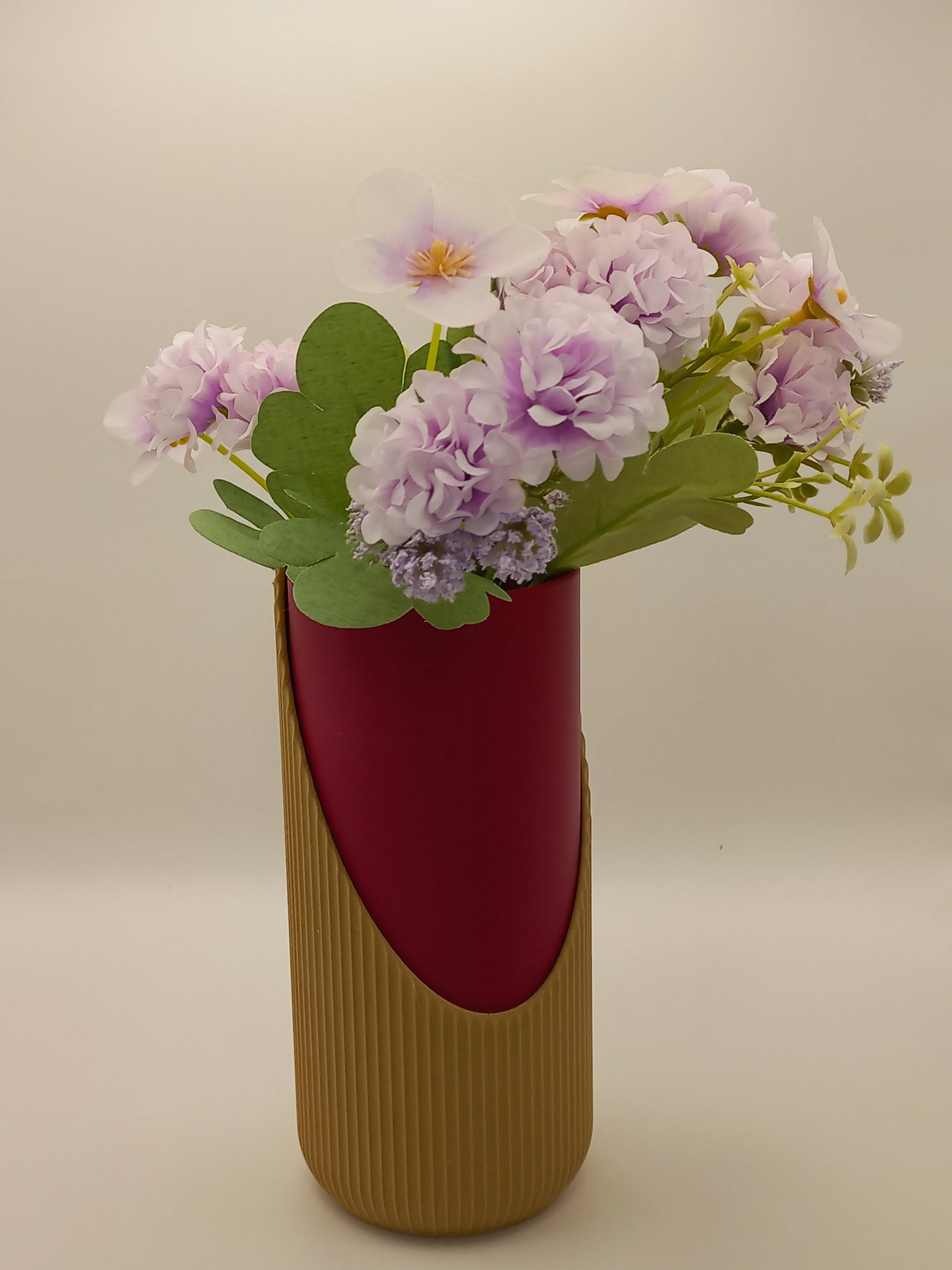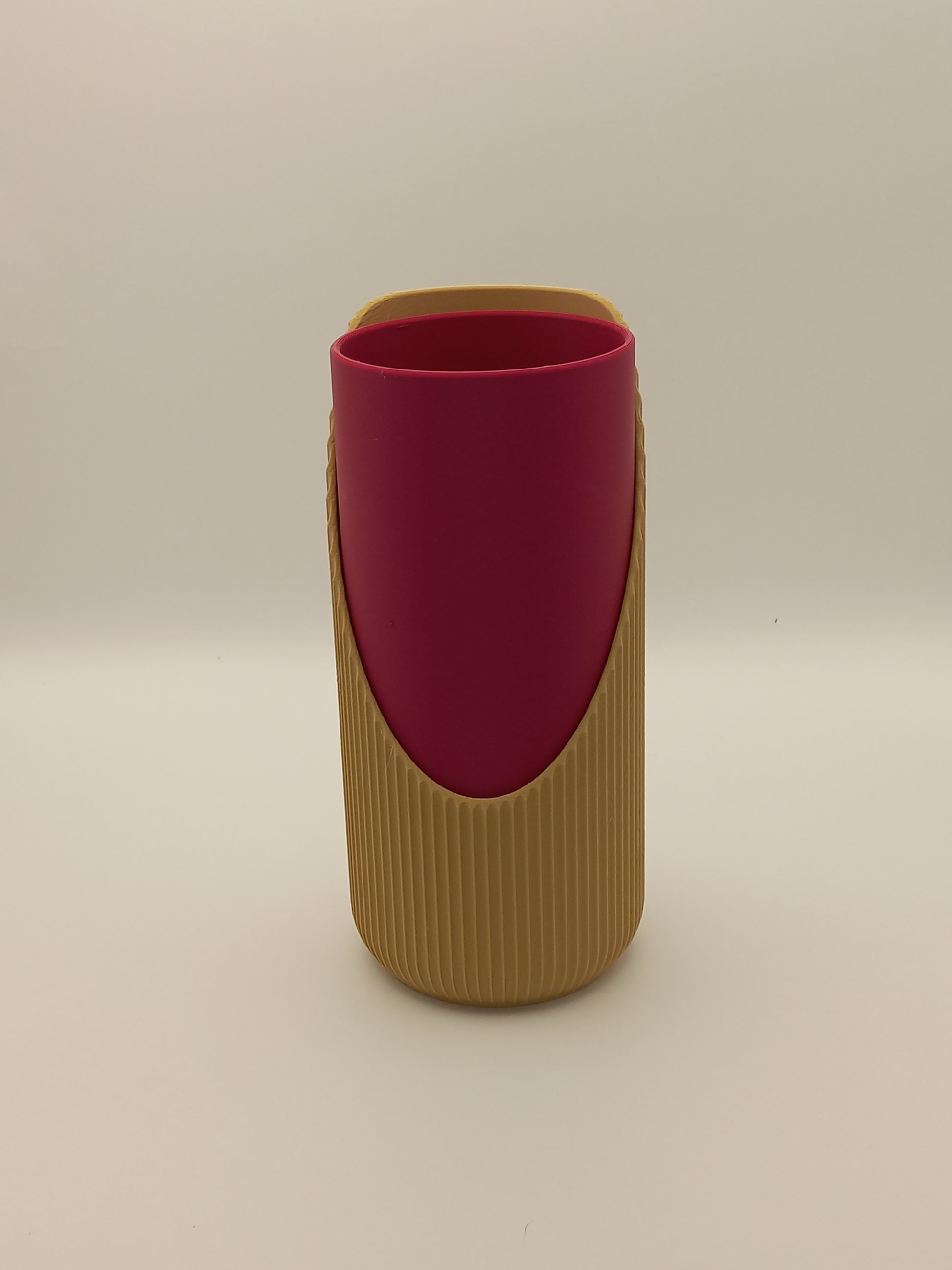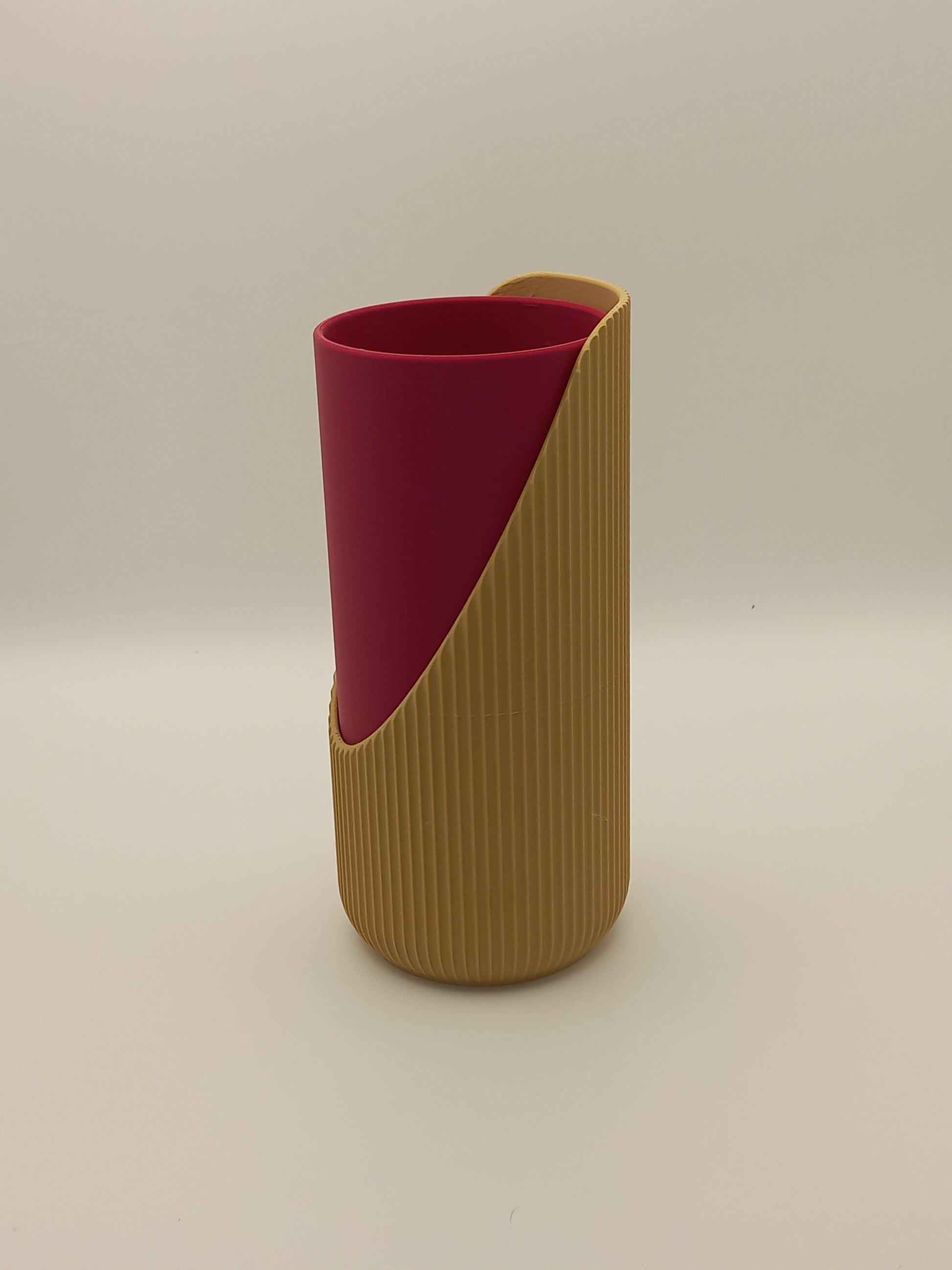 Breng een vleugje moderne elegantie in je interieur met dit stijlvolle vaasje. Het vaasje bestaat uit een gladde bordeauxkleurige binnenzijde gecombineerd met een okergele buitenkant met fijne verticale ribbels. Het unieke asymmetrische design geeft een speelse maar toch strakke uitstraling, waardoor dit vaasje perfect past in zowel een minimalistisch als een warm interieur.